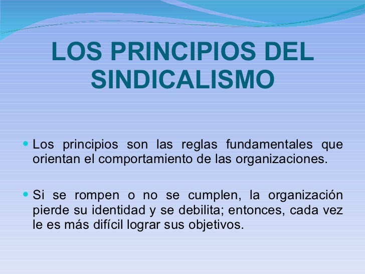 Los principios son las reglas fundamentales que orientan el comportamiento de las organizaciones. Si se rompen o no se cumplen, la organización pierde su identidad y se debilita entonces cada vez le es mas difícil lograr sus objetivos, de esta forma pierde credibilidad antes los trabajadores y antes las sociedad. Existen principios fundamentales que todo sindicato...